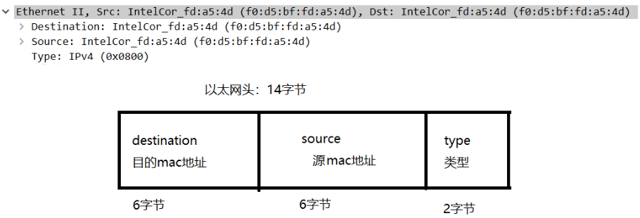 封装了 mac 地址以及目的地的地址,还有 ip 类型,又称作 mac 头,如图:
