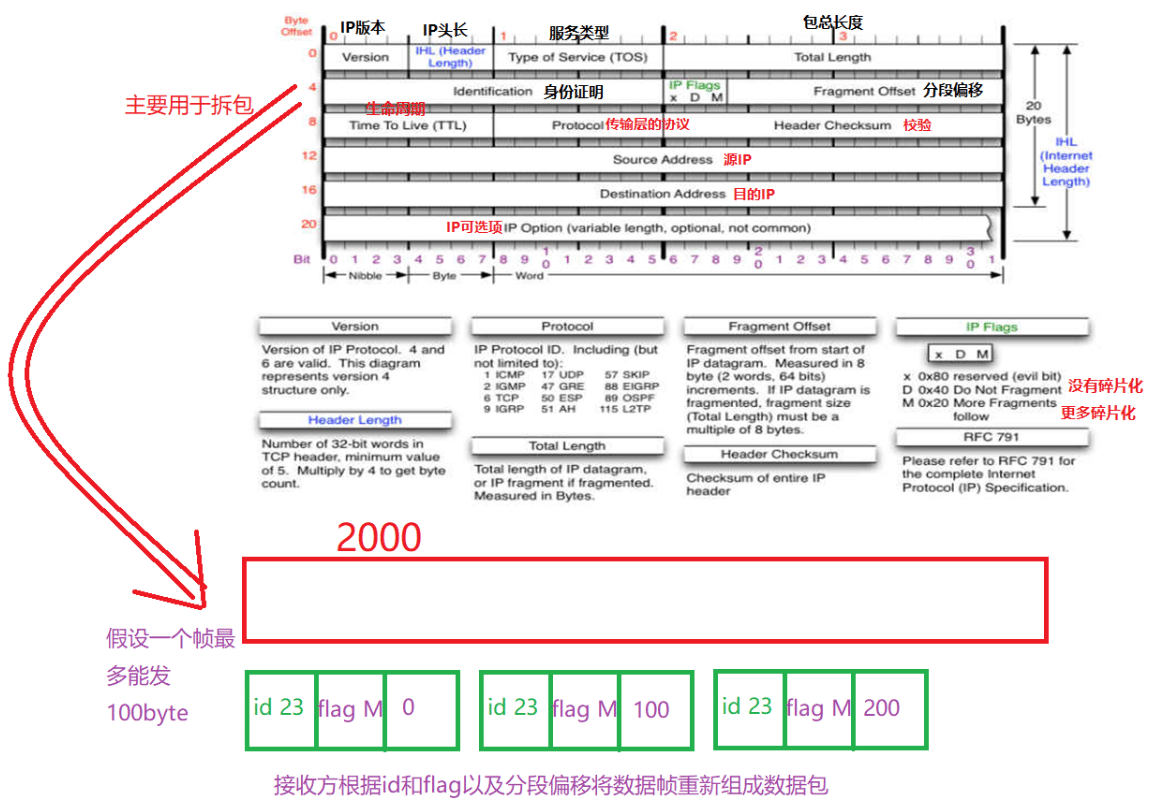 网络层主要用于拆包,IP 头中需要掌握用于拆包的部分为:id,flags,fregment_offset;两个 IP 地址:源 IP 与目的 IP 地址