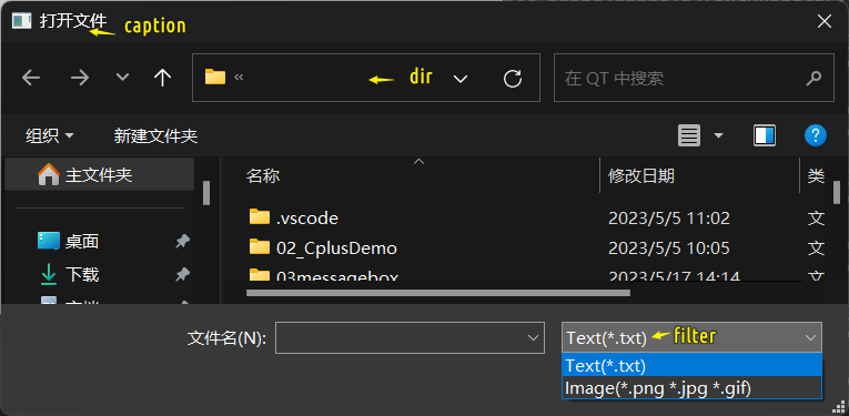 this, "打开文件", "../", "Text(*.txt);;Image(*.png *.jpg *.gif)");