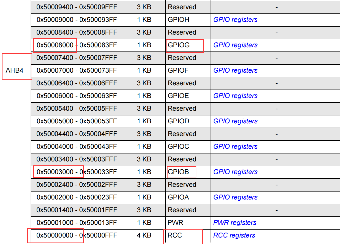 AHB4总线的部分,可以知道它们的基地址分别是:GPIOG:0x50008000GPIOB:0x50003000RCC:0x50000000