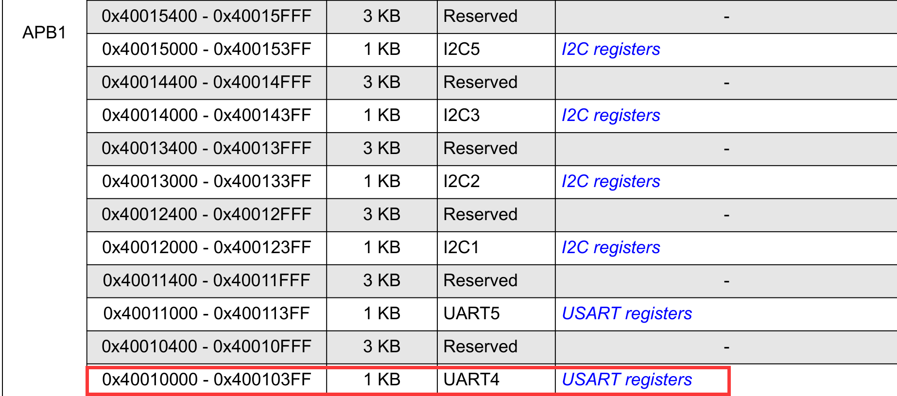 UART4的基地址,参考分析 RCC 章节为0x4001_0000