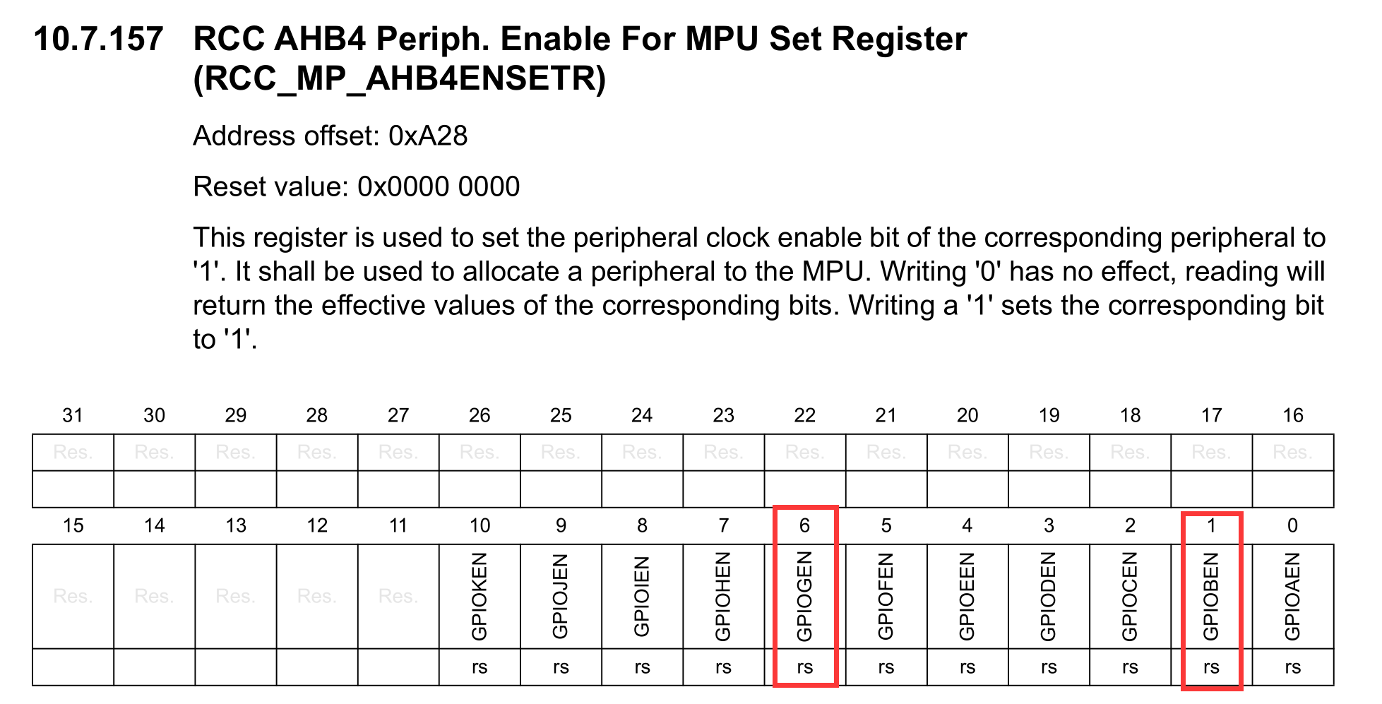 AHB4的使能寄存器AHB4ENSETR,将GPIOB,GPIOE和RCC控制器使用: RCC的基地址是0x5000_0000偏移后为0x5000_0A28为该寄存器地址- 因为需要使用这两个