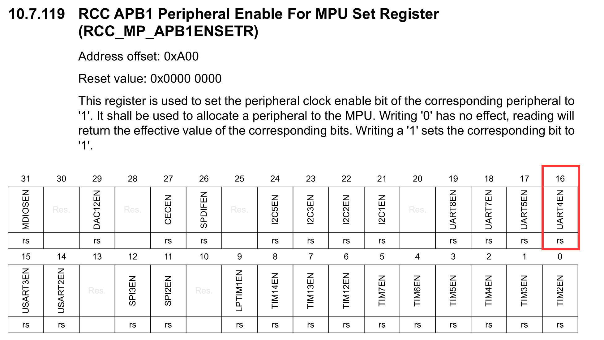 APB1的使能寄存器中APB1ENSETR,启用UART4控制器:- 它的地址是
