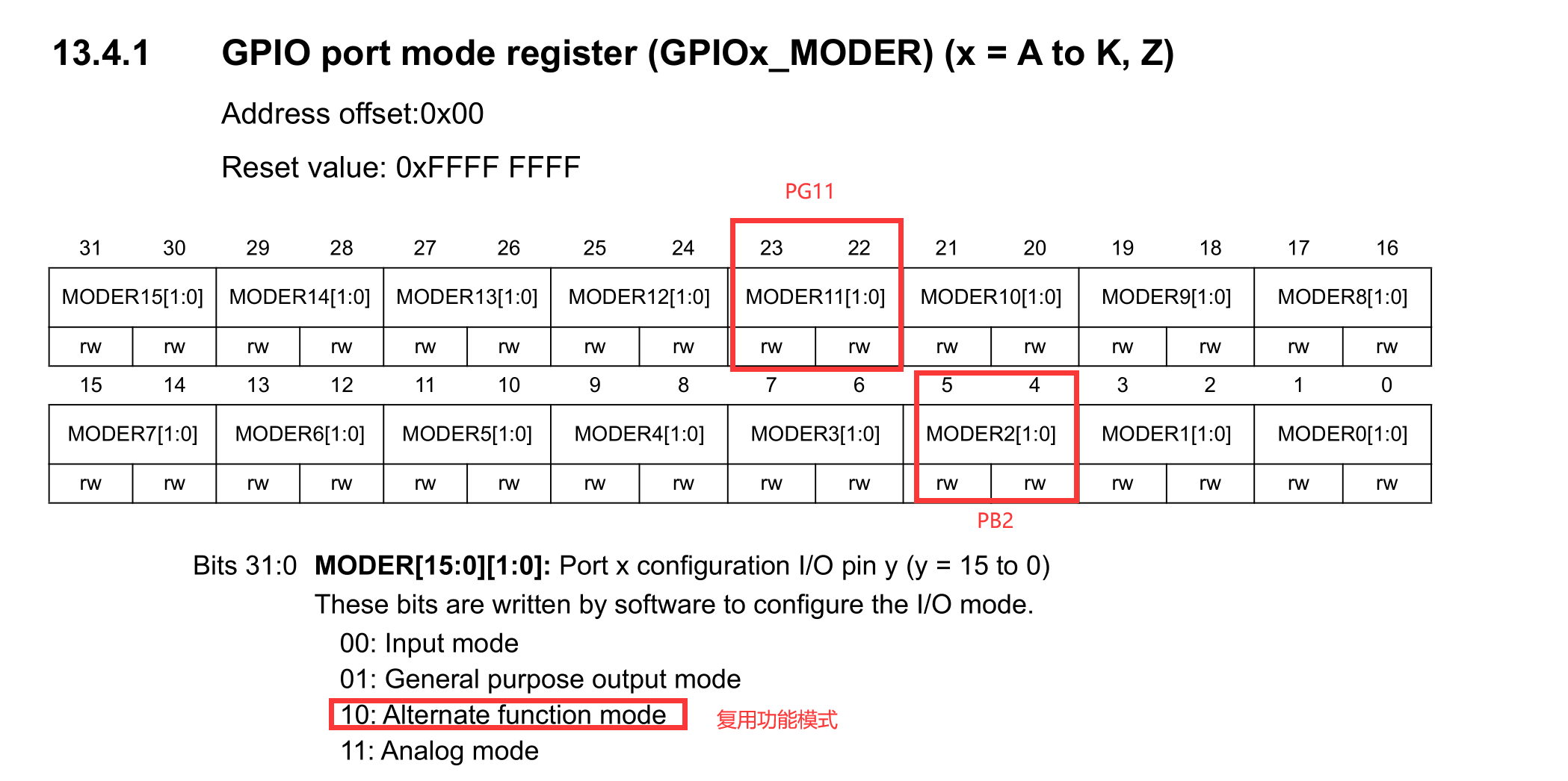 GPIOG_MODER寄存器设置PG11引脚为复用功能模式:GPIOG_MODER[23:22] = 0b100x50008000[23:22] = 0b10