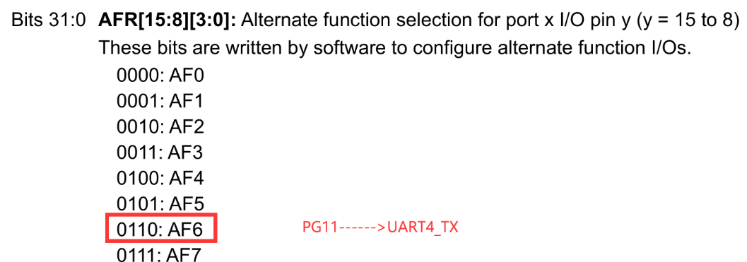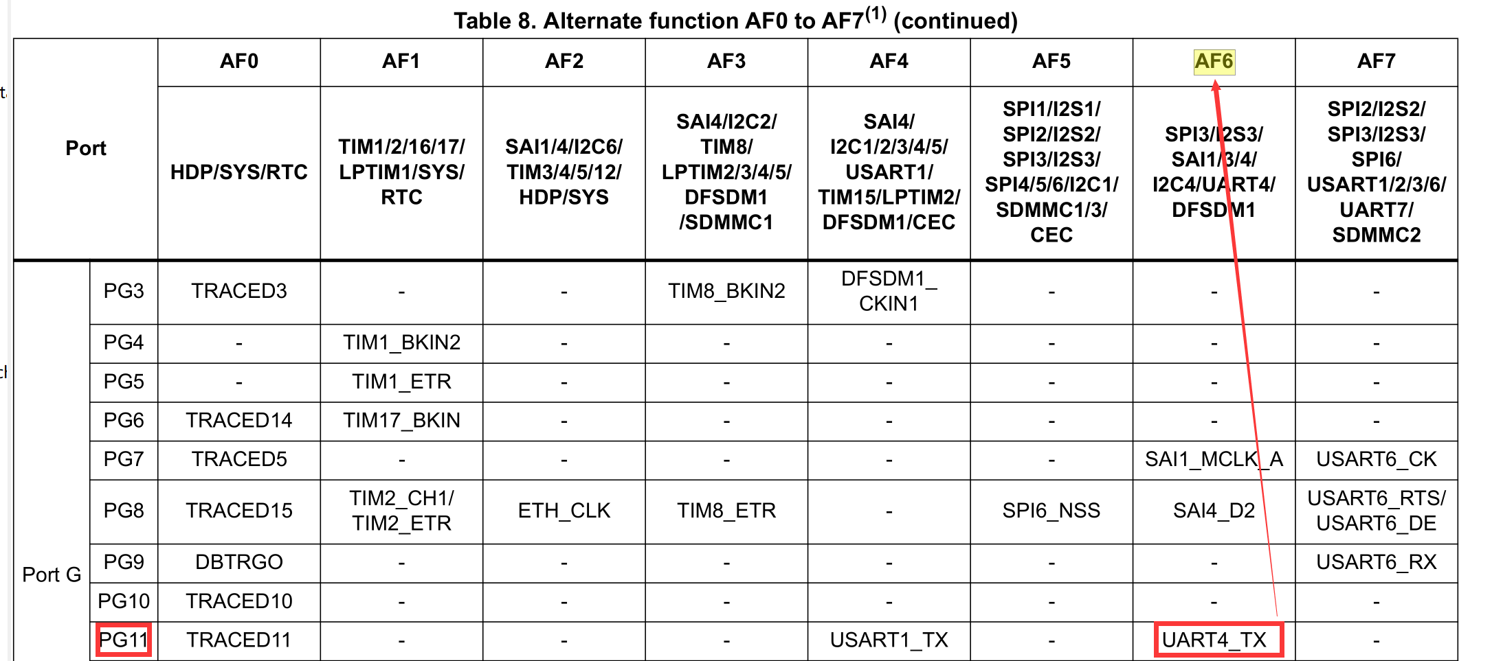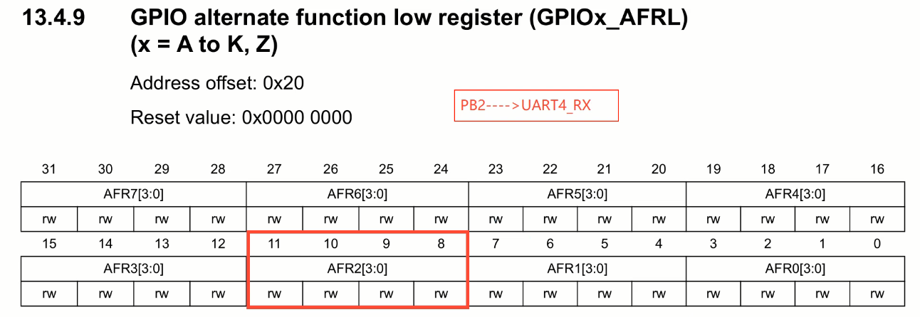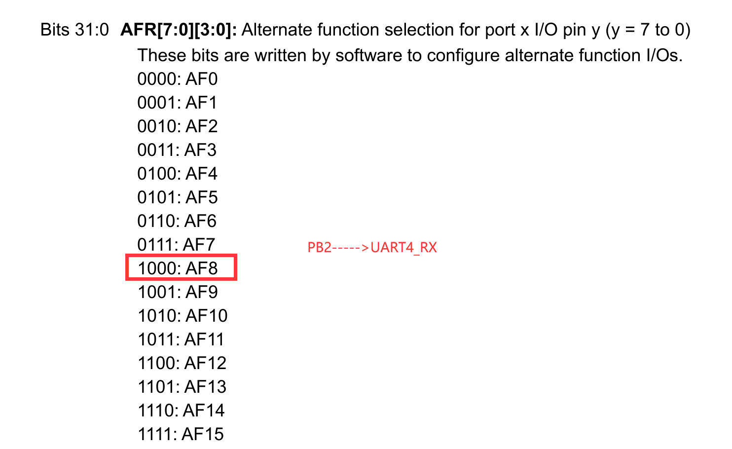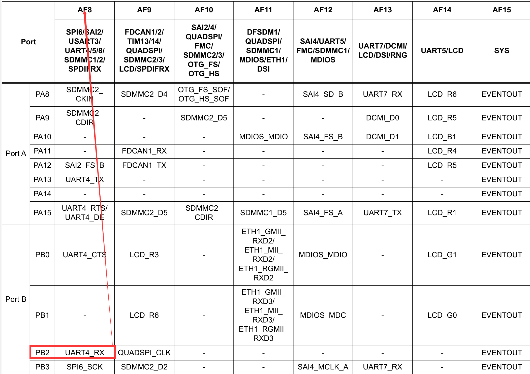 UART4_RX功能,可以看到它属于AF8一列,所以我们需要在上述的GPIOB_AFRL寄存器中填入AF8对应的0b1000