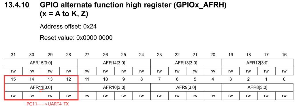 GPIOx_AFRH部分的文档中,我们需要修改的是12-15四个位: