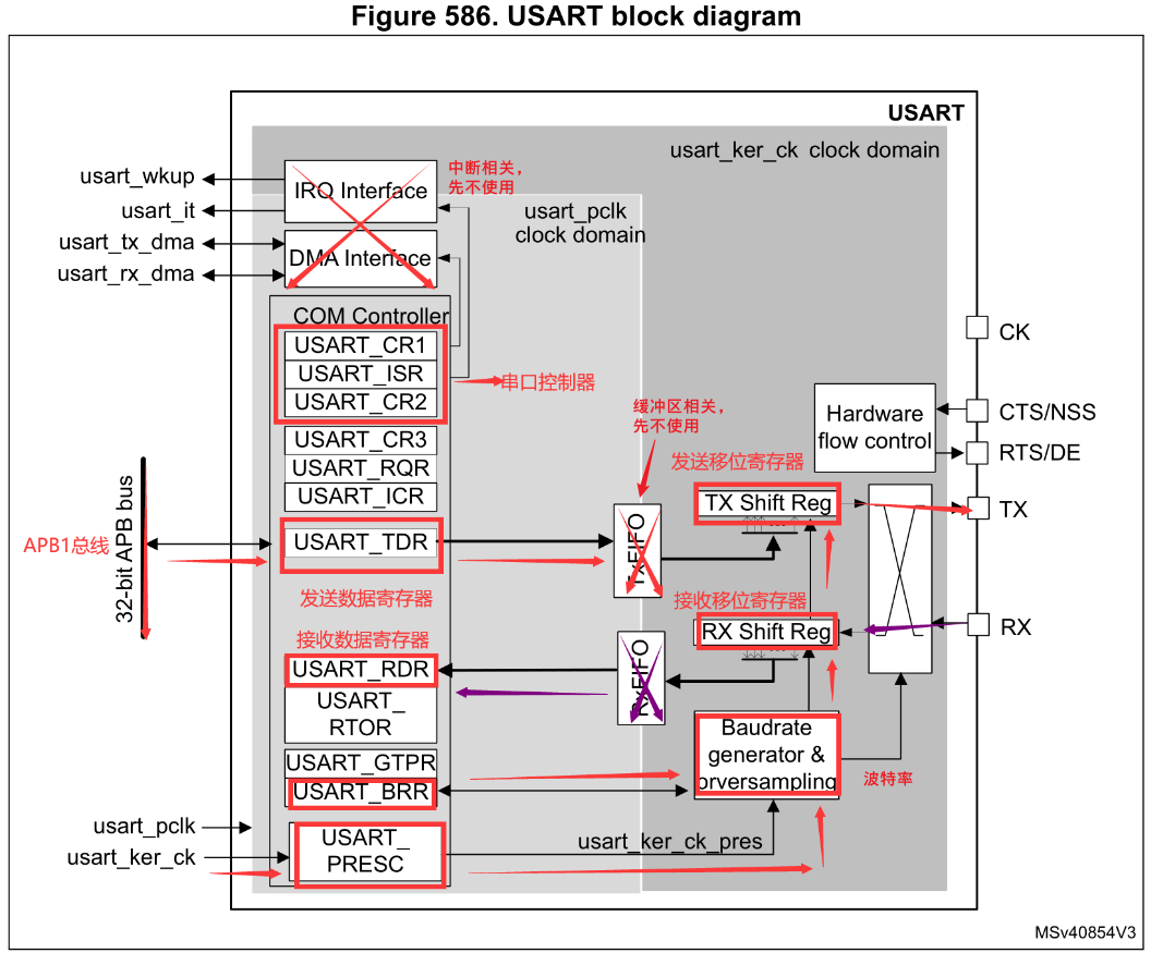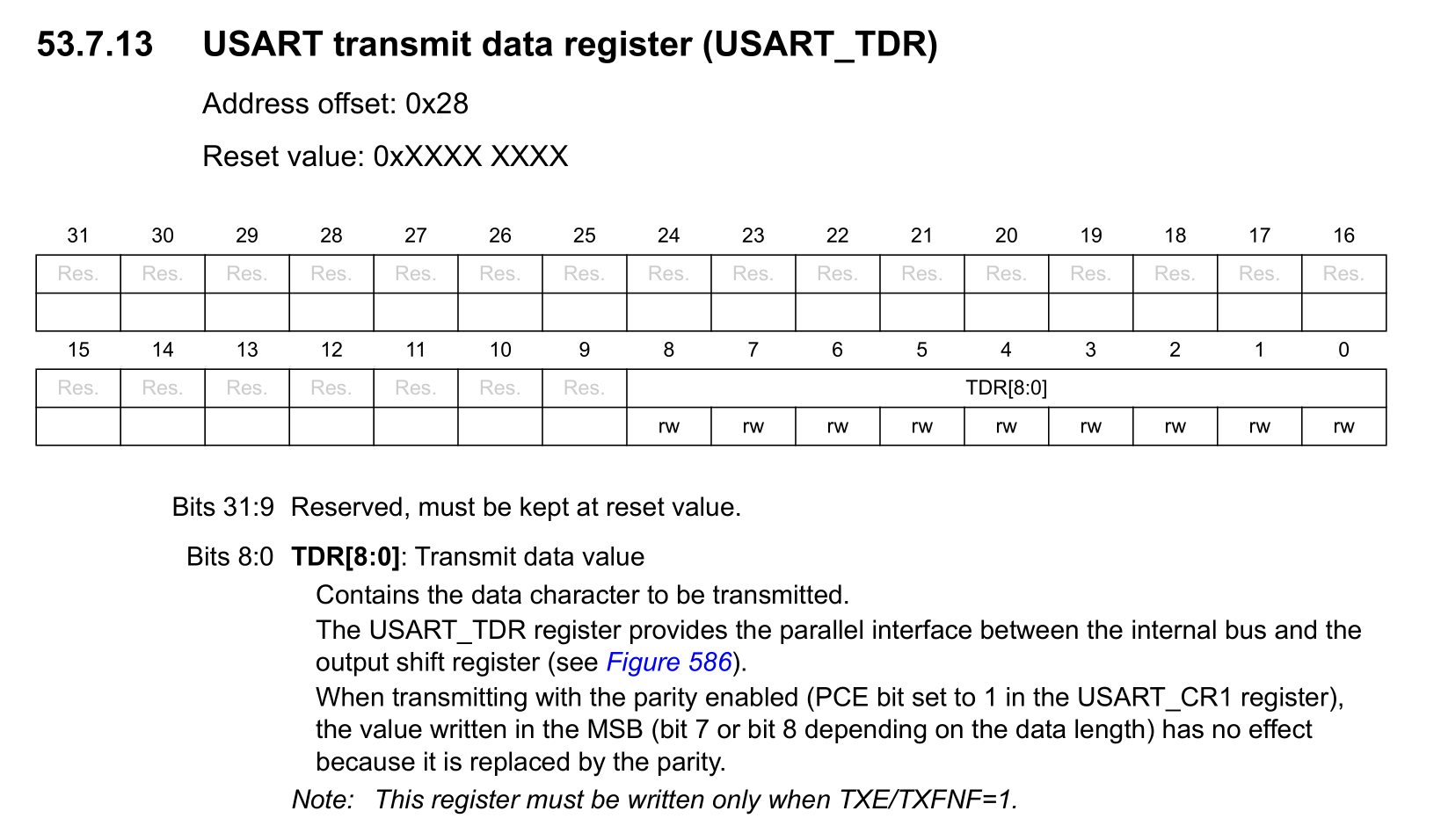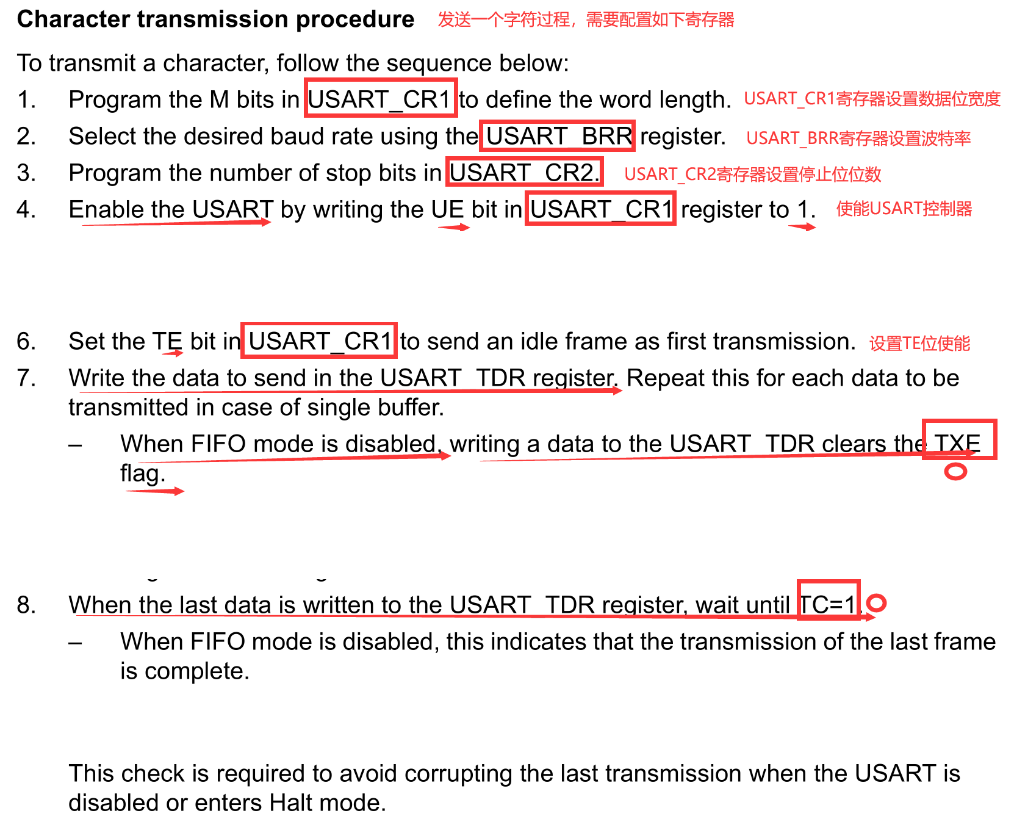 - 在 53.5.5 USART transmitter 章节,可以找到 Character transmission procedure