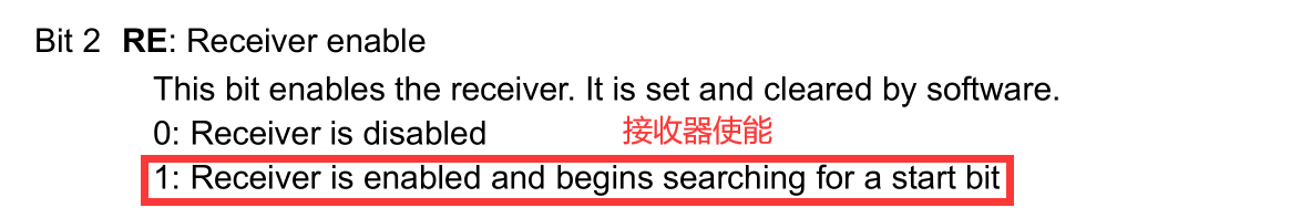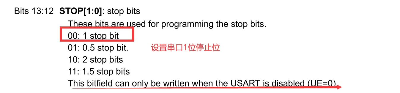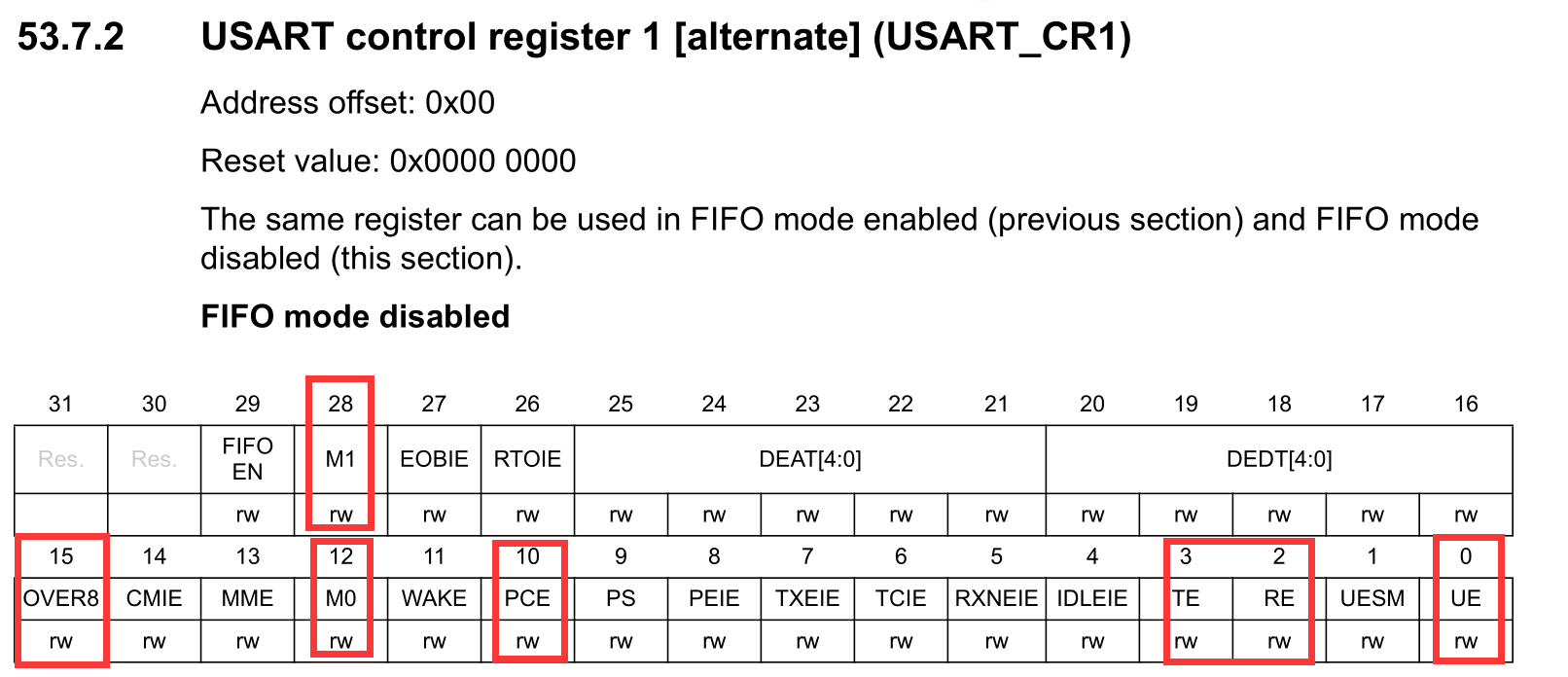 0x4001_0000 + 0x00 = 0x4001_0000USART_CR1[28][12] = 00-------> 设置8位数据位USART_CR1[15] = 0-------> 设置16倍采样率USART_CR1[10] = 0-------> 设置串口无奇偶校验位USART_CR1[3] = 1-------> 设置串口发送器使能USART_CR1[2] = 1-------> 设置串口接收器使能USART_CR1[0] = 1-------> 设置串口使能