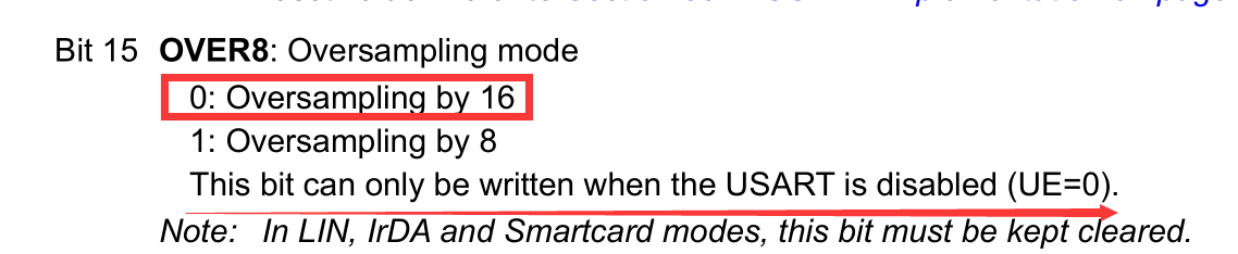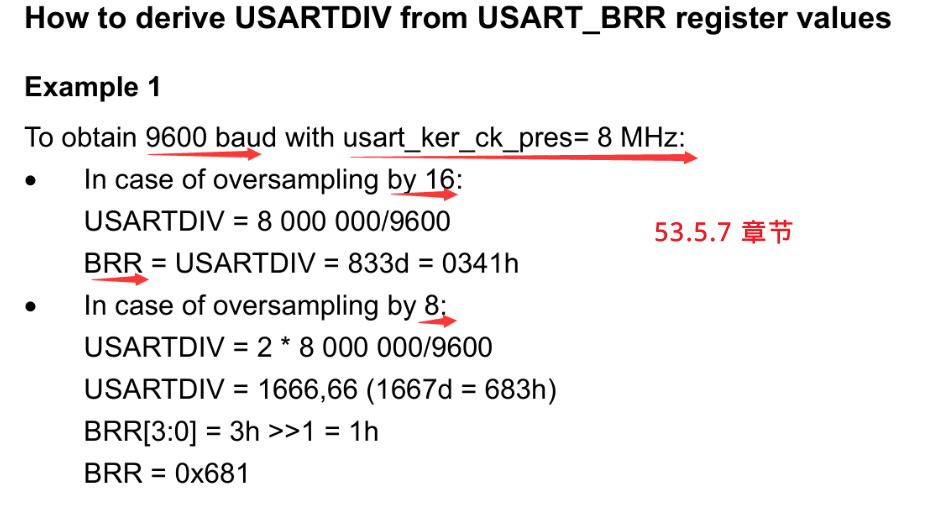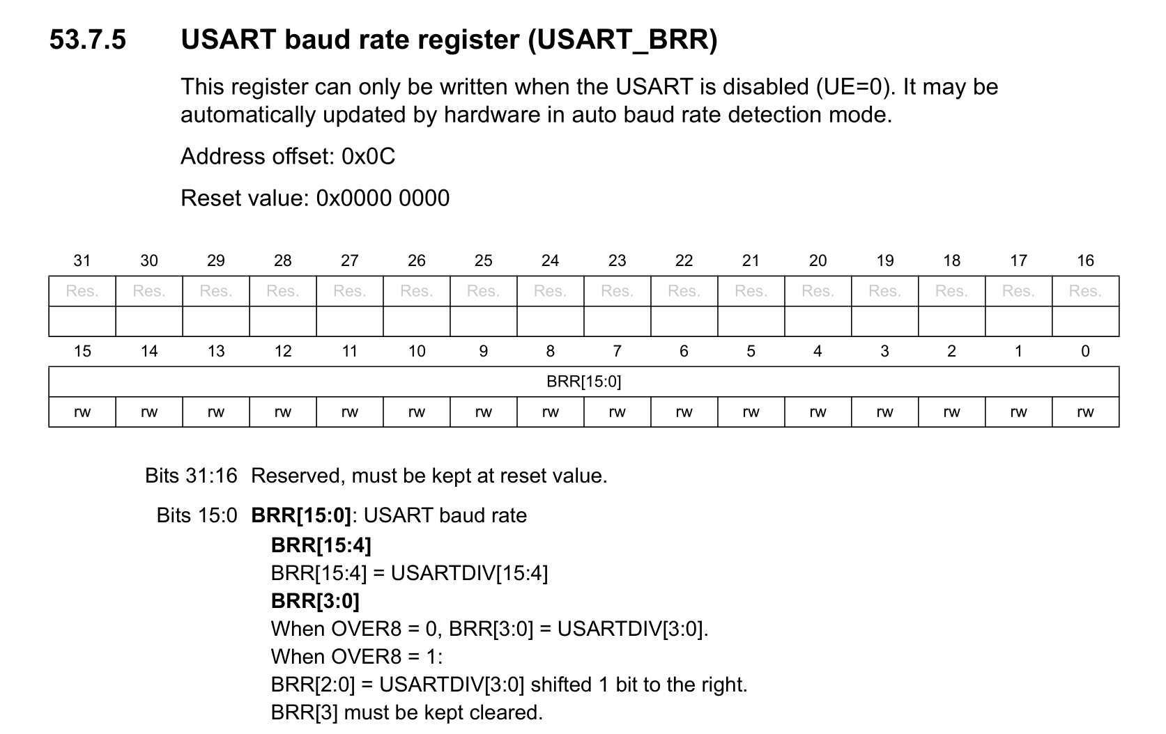 USART_BRR寄存器需要设置的值,需要参考53.5.7章节,确认串口提供的主频64MHZ(这是uboot设置的),并且设置波特率为115200USART_BRR = 64000000 / 115200 = 0x22B