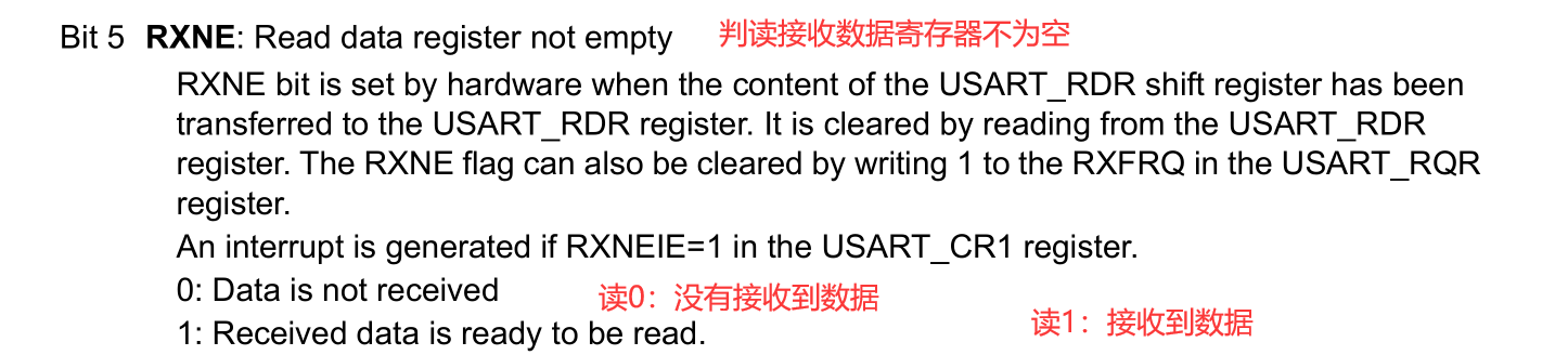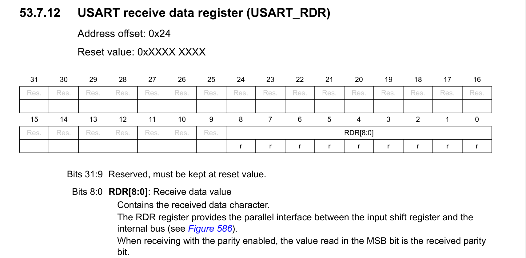 0x4001_0024 - 接收到的数据存放在串口数据寄存器中,只能读不能写