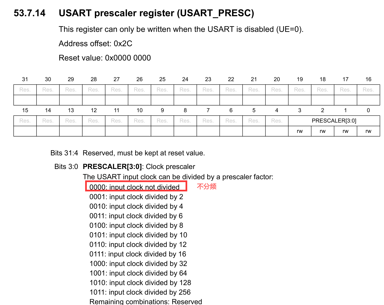 BRR寄存器,所以这里设置不分频 PRESC[3:0] = 0b0000
