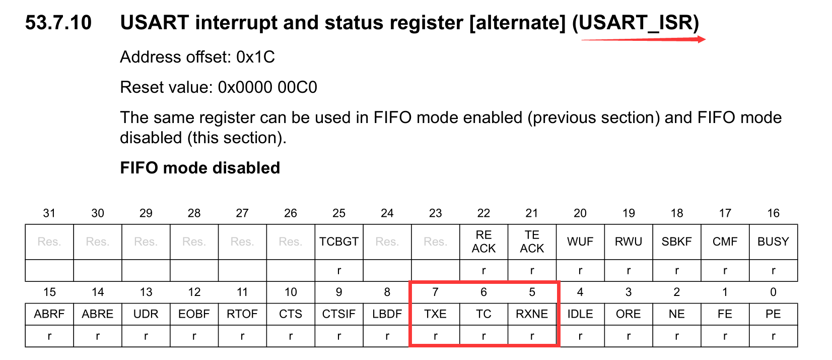 TXE位,可以 判断发送寄存器空满 UART4_ISA[7],只有空才能发送下一个字节数据,如果满需要等待