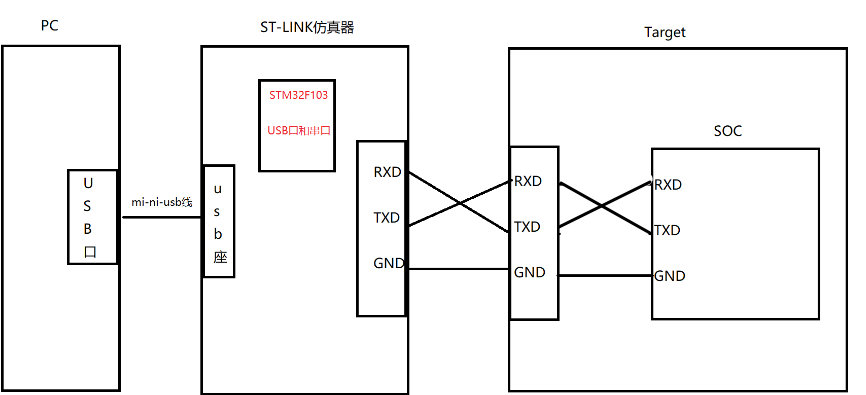 - 在 ST-LINK 仿真器内部有一个 STM32F103 芯片,在这个芯片内固化了一段代码,这段代码完成 USB 口和串口之间的转换