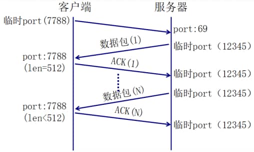当客户端发送下载请求数据包,服务器新建端口发送数据包1,当客户端保存数据包1后,发送 ACK1 给服务器,如此循环,直到客户端返回最后一个数据包对应的 ACKN,服务器得知客户端下载完成。